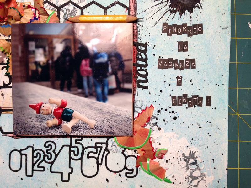 .....con due cartoncini ad imitazione di foglio di quaderno, due fustellate ad esagoni che riprendessero lo stencil, fustellate numeri e parole, timbrate di penne ritagliate e colorate con i